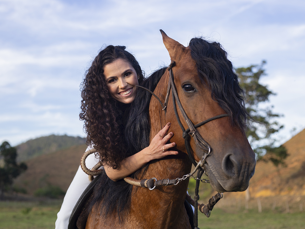 Paty junto com seus cavalos, todos sorrindo